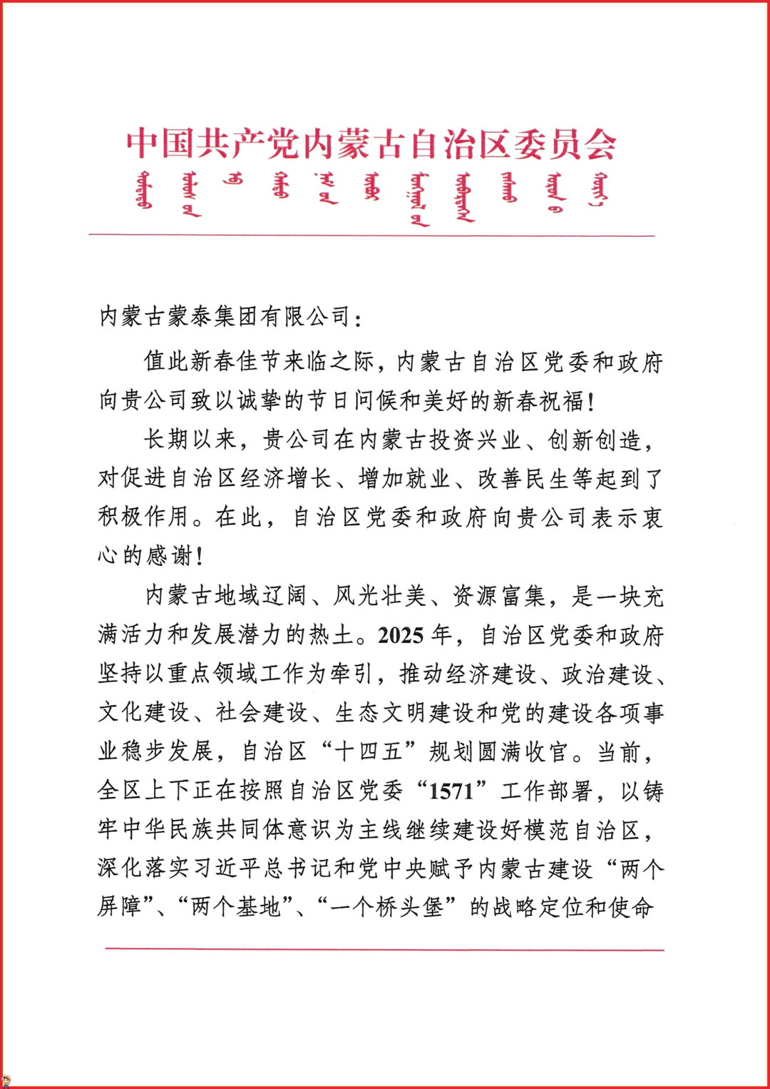 新春佳节来临之际,蒙泰集团收到内蒙古自治区党委、政府发来的新春慰问信,信中的肯定与期许让蒙泰集团全体员工倍感温暖、备受鼓舞。蒙泰集团衷心感谢自治区党委、政府一直以来的悉心关怀与大力支持,这份认可既是莫大的激励,更是前行的动力。集团将坚定在内蒙古发展的信心,紧扣自治区“1571”工作部署,持续加大投资力度、拓展业务领域,主动融入地方发展大局,以实际行动助力内蒙古现代化产业体系建设,绝不辜负党和政府的殷切希望,扎根家乡、政企携手、同心同行,为内蒙古打造模范自治区、实现高质量发展贡献更多蒙泰力量。